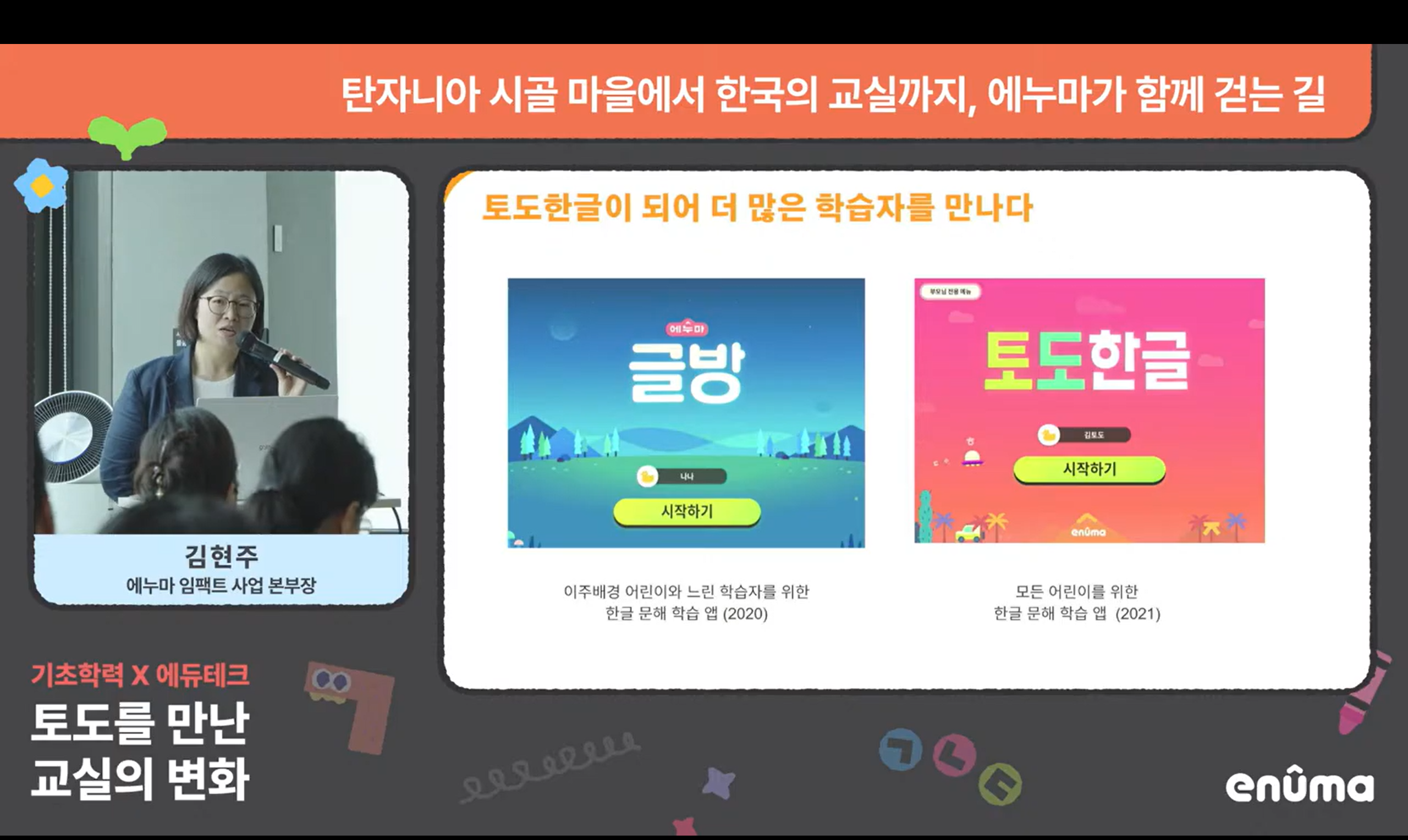 탄자니아, 파키스탄, 스리랑카 등 해외에서 학습 문제를 해결하던 에누마가 2018년 이주 배경 어린이와 느린 학습자들의 한글 문해 학습을 돕는 디지털 도서관을 만들게 됩니다. 그렇게 ‘두루책방’이 탄생하였고, 액티비티 기반의 학습 콘텐츠가 더해져 2020년 ‘에누마 글방’을 만들게 됩니다. 그리고 일년 뒤 모두를 위한 한글 문해 학습 앱 ‘토도한글’이 공개되었죠. |