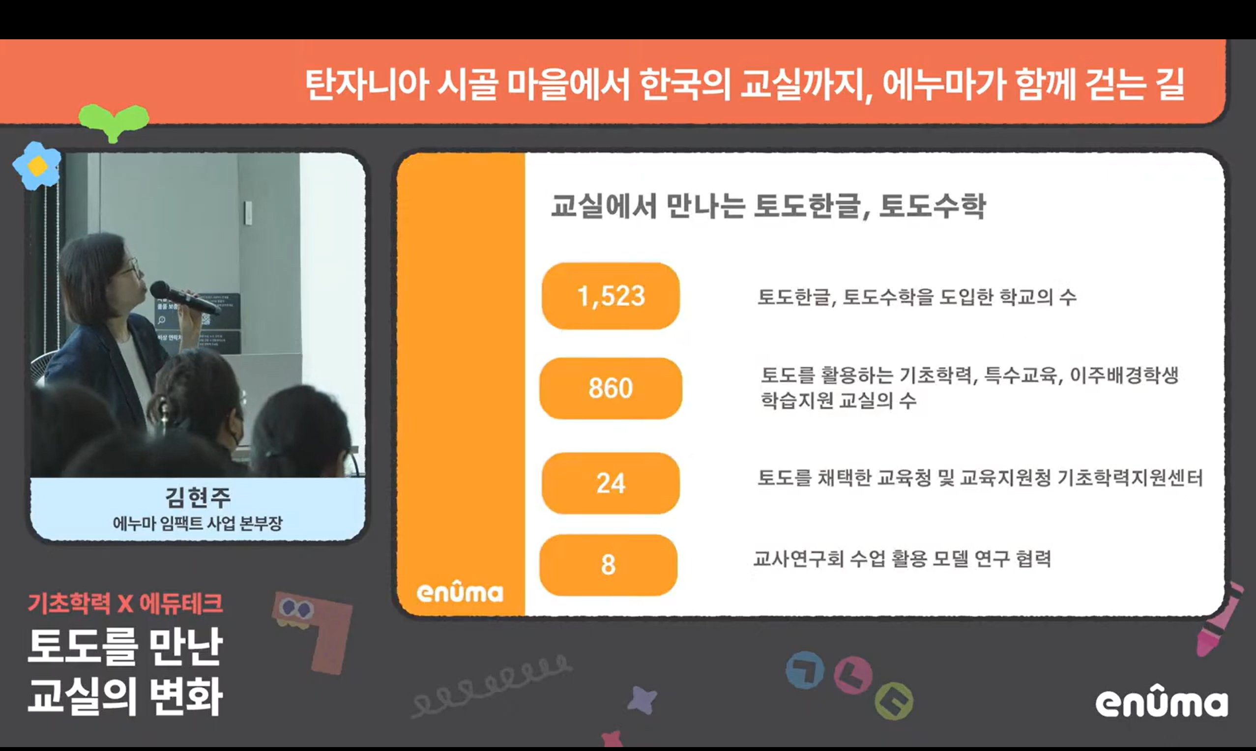 '기초학력 X 에듀테크: 토도를 만난 교실의 변화' 포럼 후기 9월의 마지막 날, 하루 일찍 화요일에 찾아온 에누마 에듀로그!🍃 앞으로 에듀로그는 매 달 마지막주 수요일, 한 개의 소식을 가지고 좀 더 가볍게 찾아올 예정이에요. 토도와 관련된 교육 현장의 이야기와 알아두면 좋을 유용한 정보를 전할 예정이니 놓치지 마세요. 오늘은 에누마에서 주최한 '기초학력 X 에듀테크 포럼' 후기를 들고 왔어요. 어떤 이야기가 오고 갔는지 지금 바로 만나보세요! |