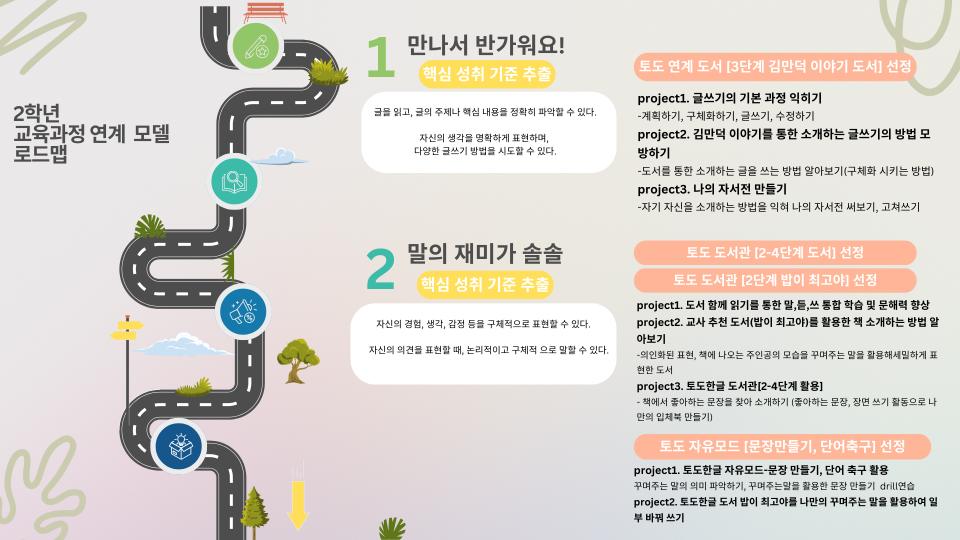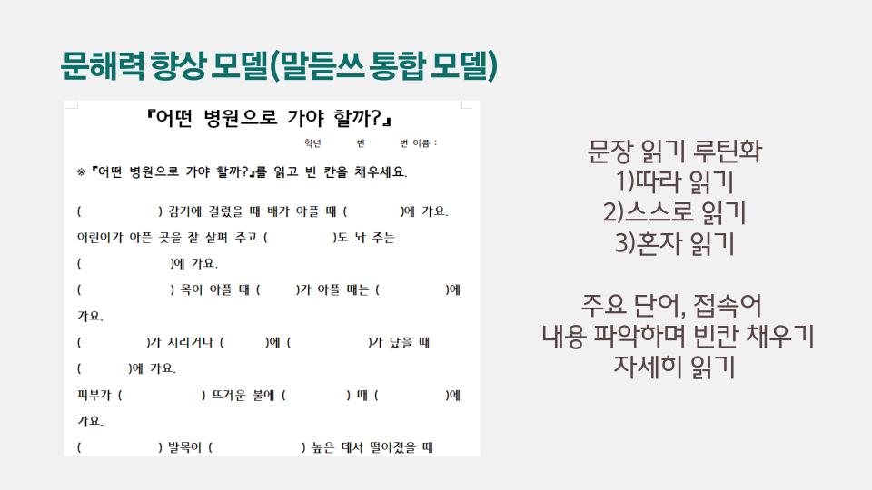 군서초등학교에서는 교사의 역할에 대한 고민을 기반으로 토도한글을 활용한 국어 맞춤형 수업 진행을 위해 '문해력 향상 모델(말듣쓰 통합 모델)'을 만들었습니다. 토도한글의 도서관 기능과 자체 제작한 활동지를 융합해 읽기, 듣기, 쓰기 활동을 진행합니다. 이에 더해, 최근에는 ‘교육과정 연계 모델’을 개발 중인데요. 교과서 내용에 얽매이지 않고 성취 기준을 중심으로 학습 계획을 짠 뒤, 연관된 토도한글 도서관과 액티비티를 활용해 수업을 계획합니다. |