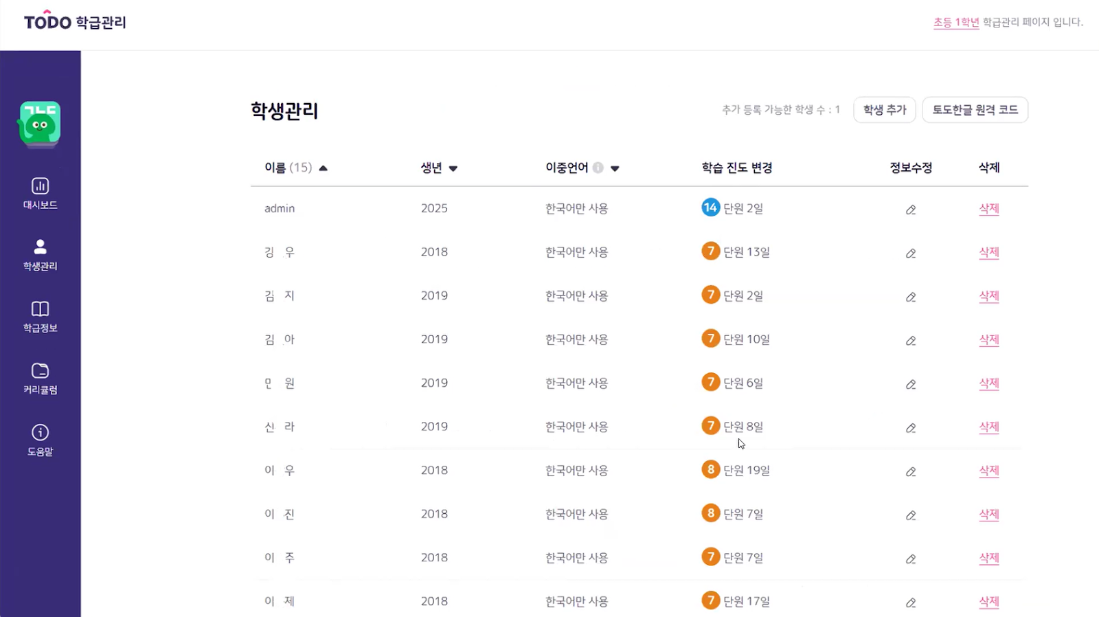 입학 적응 기간에는 그림을 그리고 글씨를 쓰는 등 직접 손으로 작업하는 활동을 했고, 5월부터 본격적으로 토도한글을 시작했습니다. 일주일에 국어 한 차시는 정기적으로 토도한글을 사용했는데요. ‘오늘의 모험’에서 해야 할 분량을 정해주고 스스로 학습하게 했어요. 학급 관리(LMS) 페이지에서 학생별 진도 변경이 가능하기 때문에, 개인별 학습 난이도를 설정했고 겹받침 등 교과서 연계가 가능한 것은 동일하게 설정해 함께 학습했습니다. |