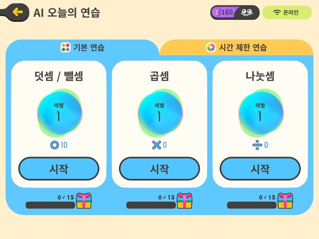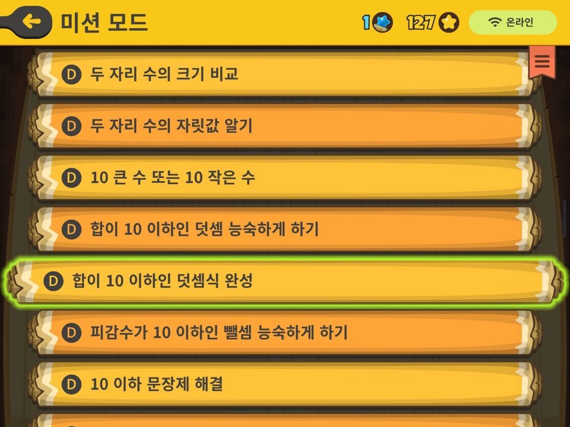이외에도 ‘미션 모드’를 활용해 1학년 교육과정과 연계해 활용했는데요. 미션모드는 학습 목표에 따라 구성되어 있기 때문에, ‘합이 10 이하인 덧셈식 완성’과 같이 현재 필요한 학습을 골라서 진행했고요. ‘AI 연습’을 활용해서 덧셈과 뺄셈 연산 연습을 할 수 있었습니다. 연산은 반복 훈련이 필요하다보니 개별 난이도에 맞춰 문제를 풀 수 있어 좋았습니다. (...)